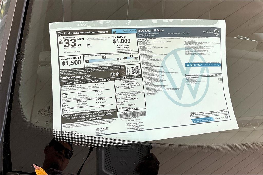 Platinum Gray Metallic 2026 Volkswagen Jetta 1.5T Sport FWD 8-Speed Automatic with Tiptronic 1.5L I-4 DI DOHC Turbocharged Bu Cloth.